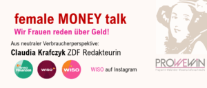 Geld kennt keine Geschlechter! Frauen verdienen finanzielle Unabhängigkeit – gut informiert und inspiriert bewegst Du dich sicher durch die Welt der Finanzen. Der female Money Talk ist unser Weg, Dich als Frau bei deiner Zukunftsplanung zu unterstützen. Mit ZDF-WISO Redakteurin Claudia Krafczyk an unserer Seite, die neutral aus Verbrauchersicht berichtet und unsere Fragen beantwortet. Deine finanzielle Stärke liegt in deinen Händen. Wage den Schritt zur Unabhängigkeit und starte gemeinsam mit uns. Der female Money Talk begleitet dich dabei.